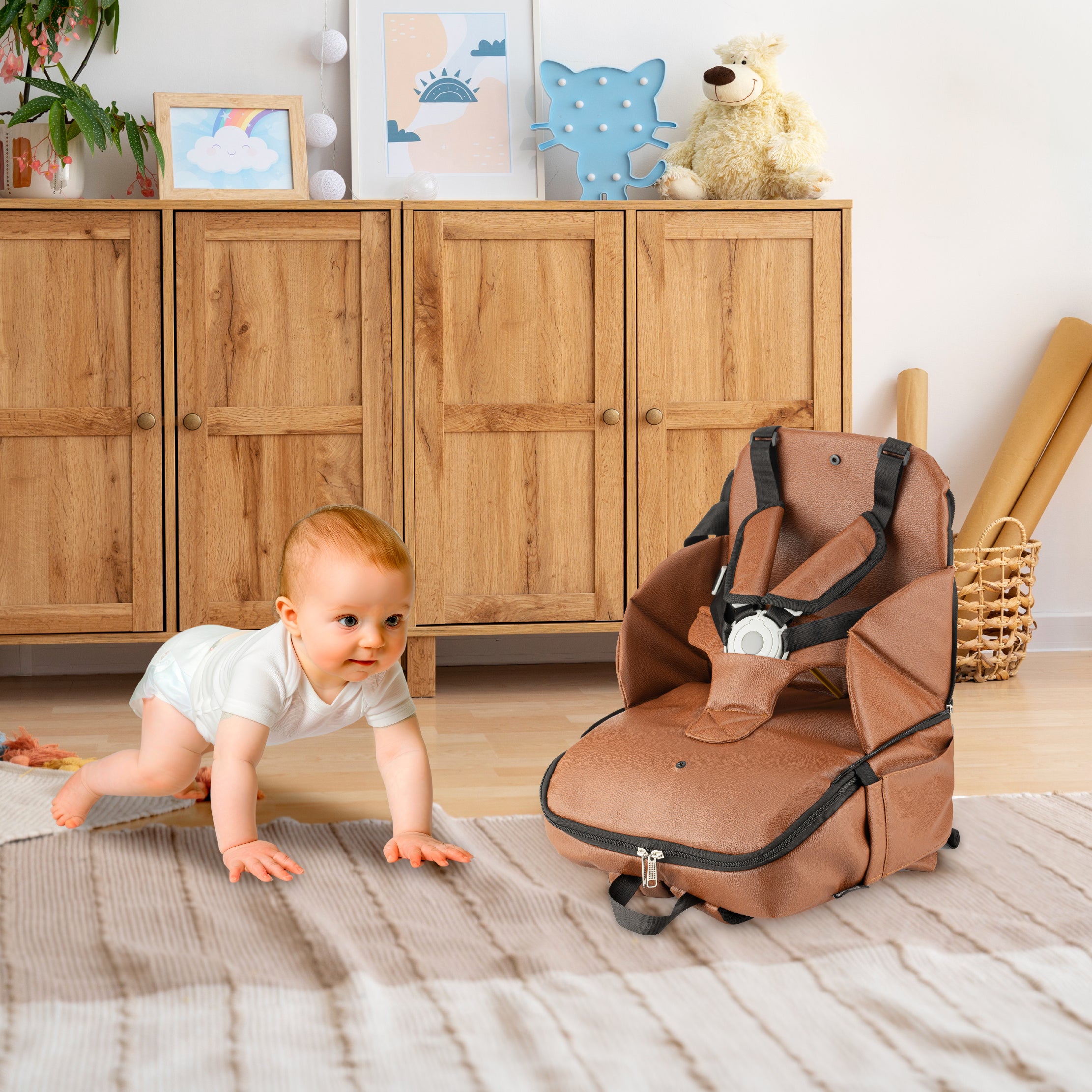 - وظيفة 2 في 1: تتحول من حقيبة أنيقة للوالدين إلى مقعد داعم آمن.