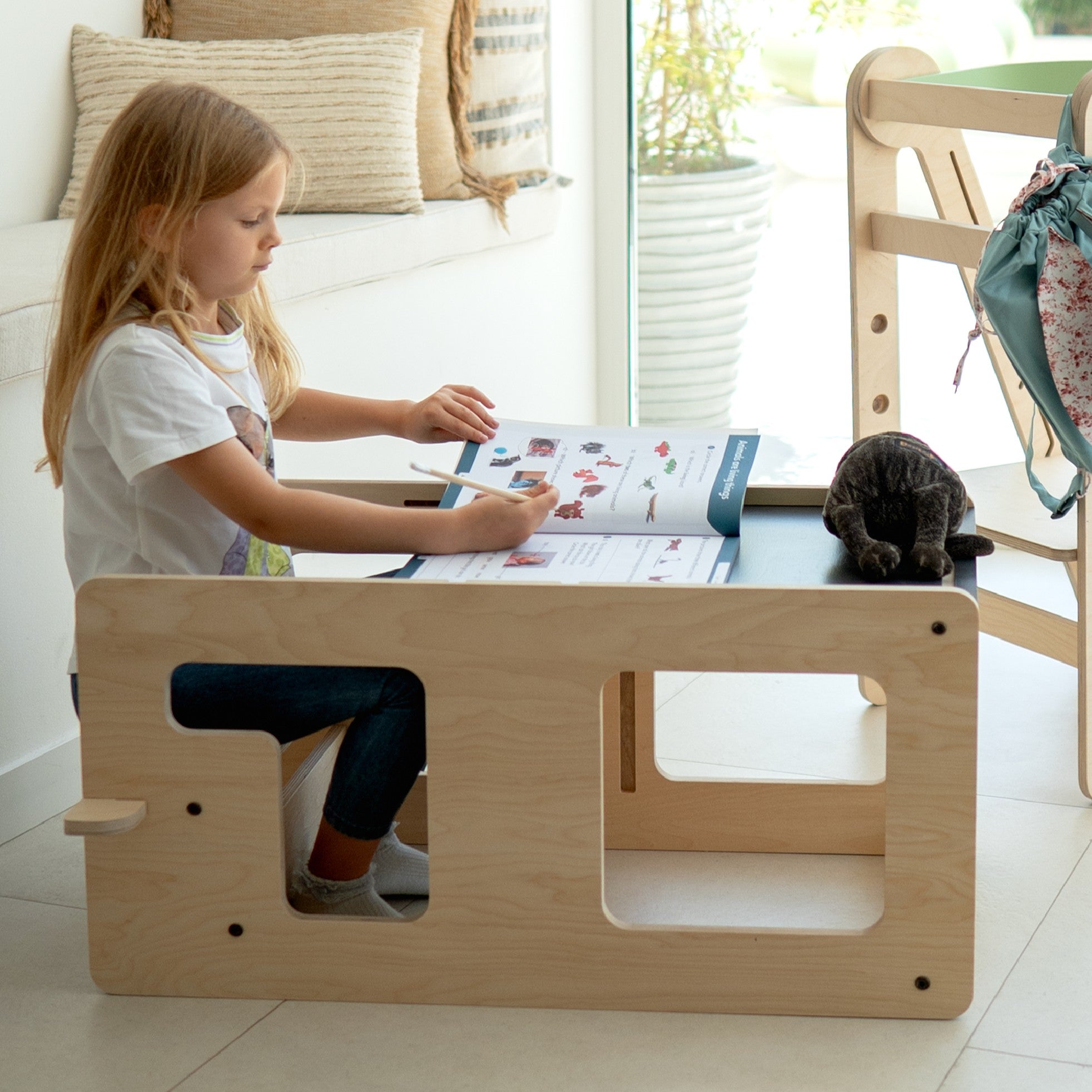 This innovative design makes transitions simple, one moment your child is exploring at counter height, the next they’re drawing, crafting, or playing at their own table. A true all-in-one solution for modern families.